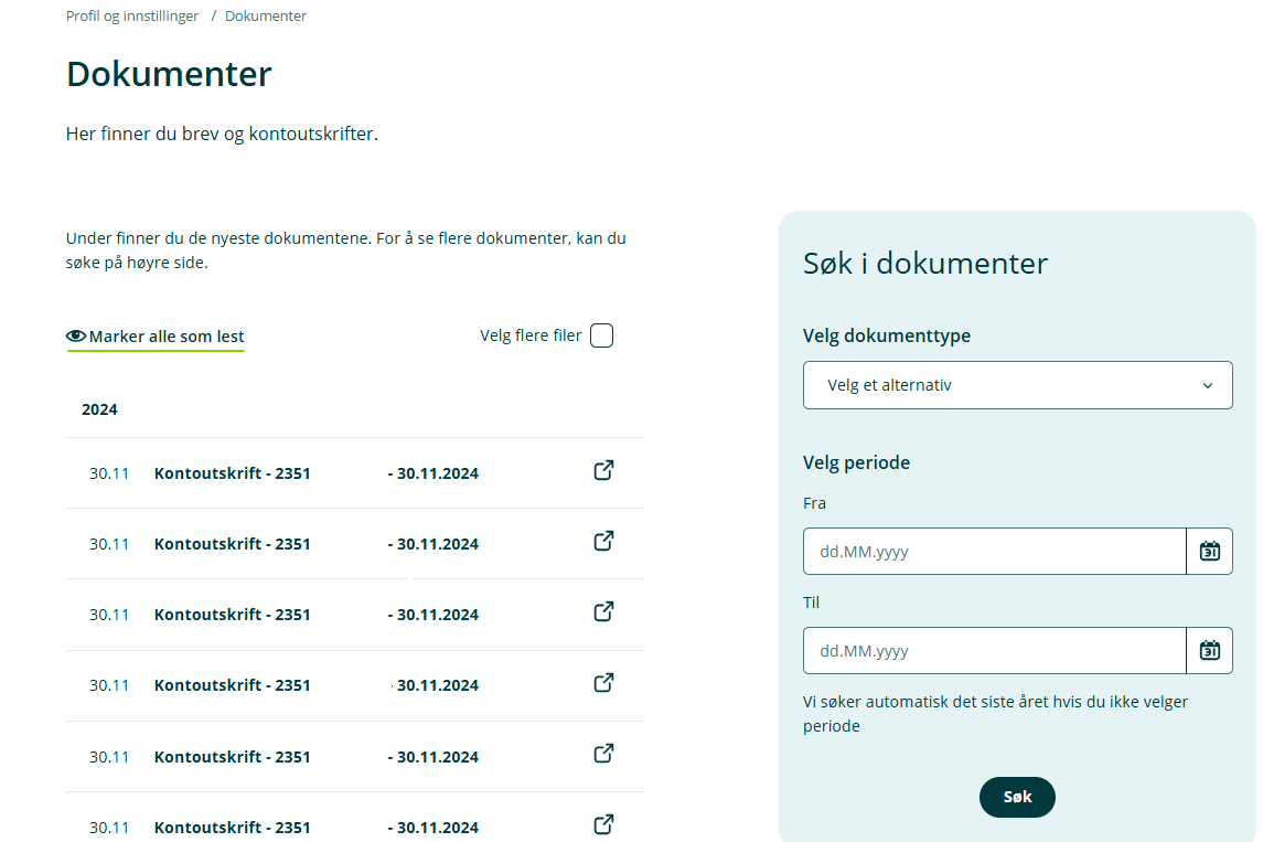 Du vil først få oversikt over de nyeste meldingene. Meldinger som er ulest/uåpnet vil være markert i fet skrift. Ønsker du å søke etter dokumenter i arkivet, bruker du søkefunksjonen til høyre. Her kan du velge flere dokumenter og velge om du vil laste de ned enkeltvis (flere PDF-filer i en .zip-fil) eller samlet (én PDF med flere sider). Det er ingen begrensning på hvor mange dokumenter du kan laste ned samtidig.